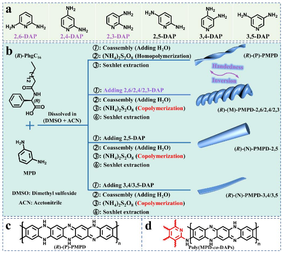 设计人工系统来模仿手性超结构以及探究非手性分子如何精准调控其手性对于理解自然界同手性的起源至关重要。手性聚合物凭借优异的环境耐受性和功能可设计性被广泛应用于对映体分离、不对称催化和圆偏振发光等领域。制备宏观螺旋聚合物最常使用超分子模板法,其中活性单体在超分子模板的作用下发生限域聚合来转录出螺旋构型。而对于经典超分子模板法,最大的弊端在于无法使用一种模板分子可切换地制备出两种螺旋性的产物。有鉴于此,王栋教授团队充分利用超分子手性的动态可调节性,在对映体纯的模板体系中通过引入一系列非手性共聚单体来调控超分子转录体系的空间堆砌模式,使所得手性聚合物具有可控的螺旋性及手性光学活性。此外,基于这种非手性单体共聚调控的策略也建立了一个螺旋功能共聚物库,包括导电高分子和一系列胺-醛缩合型聚合物。