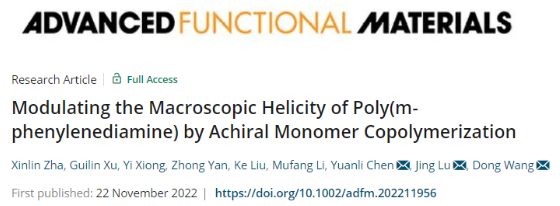 11月22日,材料领域国际顶级期刊《先进功能材料》(Advanced Functional Materials,影响因子19.924)在线发表我校王栋教授团队在非手性单体共聚调控手性聚合物宏观螺旋性方面取得的重要进展—“Modulating the Macroscopic Helicity of Poly(m-phenylenediamine) by Achiral Monomer Copolymerization”,文章DOI:https://doi.org/10.1002/adfm.202211956。武汉纺织大学纺织纤维及制品教育部重点实验室为该论文的唯一署名单位,通讯作者为该平台王栋教授、卢静博士和陈媛丽教授,论文第一作者为我校技术研究院2021届硕士毕业生查新林。本论文是该平台于2022年发表的第二篇Advanced Functional Materials。