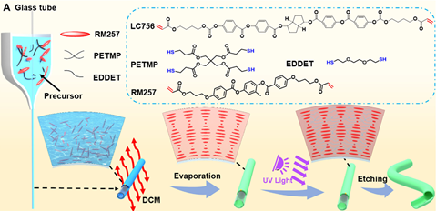 ABSTRACT:Mechanochromic cholesteric liquid crystal elastomer (CLCE) are unique anisotropic rubbers with programmable optical properties in response to external stimuli, bringing considerable interest in display, sensing, and smart textiles. However, creating mechanochromic CLCE fibers with high sensitivity, excellent resilience, and stable color-changing reversibility is still a challenge. This work describes mechanochromic CLCE symmetric hollow fibers with excellent radial helix alignment prepared by solvent evaporation-induced assembly and template assistance. The cylindrical symmetry renders the response identical in all directions perpendicular to the fiber axis. The hollow f ibers show mechanochromic ability in the full visible spectrum, a large wave length blueshift of 2.25 nm·%−1 under low strain. Excellent mechanochromic reversibility of 100 cycles and resilience are both devoted by cross-linking struc ture in the wall layer, which also contributes to reversible orientation-recovery of liquid crystal units during stretching-recovery cycles. Numerical models and experimental measurements demonstrate the hollow structure enabled fibers to produce air pressure inside when being stretched, and the fiber wall layer is subjected to greater stress compared to solid fibers, thus achieving high mechanochromic sensitivity. In addition, hollow fiber can still change color when subjected to the expansion stress inside the cavity, and programmable information display in fabric prolongs its application in intelligent textiles.