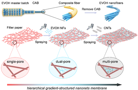 ABSTRACT:Interfacial solar desalination offers a promising approach to tackle global freshwater scarcity. However, achieving stable evaporation while simultaneously producing freshwater and collecting salt remains challenging. Here, we developed a hierarchical gradient-structured nanonets membrane (PF/EVOH/CNTs) by simple spray- coating poly(ethylene-co-vinyl alcohol) (EVOH) nanofibers and single-walled carbon nanotubes (SWCNTs) onto a commercial filter paper (FP) substrate. When the amount of SWCNTs is 0.3 wt%, the membrane's gradient nanonets architecture and superhydrophilicity enable efficient separation of oil-in-water emulsions. Leveraging its flexibility, we constructed a 3D mangrove-inspired evaporator, which achieves an evaporation rate of 2.43 kg m-2h-1 and an exceptional energy conversion efficiency of 128% under 1-sun illumination. The 3D design facilitates edge-preferential salt crystallization, allowing automatic detachment under gravity, yielding 3.44 g of salt at a rate of 43.14 g m-2 h-1 —twice that of a 2D counterpart. This work presents a multifunctional platform integrating oil-water separation, desalination, and salt recovery, advancing solar-driven water purification technologies.