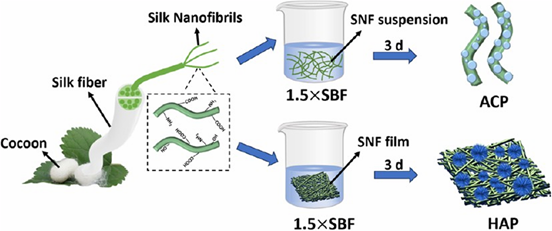 ABSTRACT:Nature organizes the extracellular matrix into hierarchical structures, inspiring the design of biomimetic mineralization scaffolds. Silkfibroin, a noncollagenous structural protein, is a potential template for biomineralization. Here, we show the mineralization behavior of silk nanofibril (SNF) and demonstrate tunable biomineralization through the SNF assembly. We demonstrate the deposition of amorphous calcium phosphate and its transformation into flower-like hydroxyapatite crystalson the SNF interface by exploiting individual SNFs as a model.On two-dimensional (2D) films and three-dimensional (3D) scaffolds, SNF assembly influences the mineralization process.The dense nanofibrils in the SNF film and scaffold undergo mineralization through the anchoring and deposition of hydroxyapatite,whereas the modified 3D scaffolds with fluffy SNF are comparable to individual SNF.Consequently, silk nanotechnology makes use of acontrollable assembly to build one-dimensional, 2D, and3D nanostructures.The seresults offer new insights into the mineralization mechanisms of silk mesoscopic units and provide pathways for the synthesis of biomineralized scaffolds.