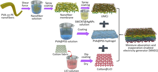 We propose a moisture absorption and evaporation-enabled electricity generator (MAEG) inspired by the transpiration process of trees. The absorption layer of the MAEG is composed of a PSS@PVA hydrogel and a cotton fabric impregnated with lithium chloride (cotton@LiCl) to improve moisture absorption. The evaporation layer of the MAEG comprises a unidirectional moisture conduction Janus nanofiber membrane (UMCJ) that enhances water transportation and evaporation. Under ambient conditions, a single MAEG generates an open-circuit voltage (Voc) of 0.74 V and a short-circuit current (Isc) of 621.64 μA, maintaining a Voc of 0.75 V and an Isc of 61.54 μA after 50 days. The output performance of the MAEG exhibits minimal variation when bent from 0 to 180o. A maximum power density of 18.72 μW/cm2 is achieved with an external of 910 Ω. The scalability of the MAEG is impressive, with a series connection of 70 MAEGs yielding a Voc of 48.80 V, while a parallel connection of 70 units achieves an Isc of 45.77 mA. Notably, a series connection of three MAEGs can power an LED for over 5 days. Additionally, an array of 5x20, totaling 100 MAEGs, can directly charge a mobile phone without rectifier circuits or capacitors.