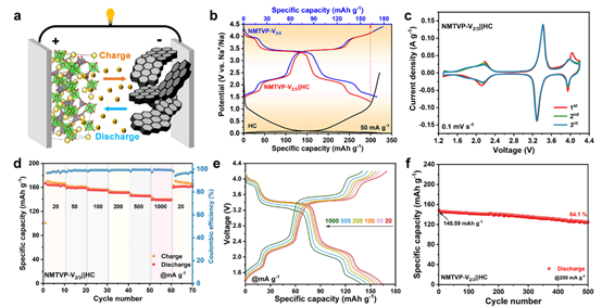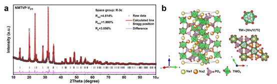 Abstract:Manganese-based NASICON cathodes enable high-energy-density sodium-ion batteries via multi-electron Mn2+/3+/4+ redox and fast Na+ diffusion. However,they suffer from Jahn-Teller distortion(Mn3+ ), causing structural degradation and compromised rate/cycling stability. Herein, a medium-entropy engineered Na3Mn2/3Ti2/3 V2/3(PO4)3 cathode material, synthesized via a scalable ball-milling method is reported, which integrates the Ti3+/4+,V3+/4 ,and Mn2+/3+ redox couples. The NMTVP-V2/3 achieves a reversible capacity of 178.8 mAh g-1 at 20 mA g-1 and an energy density of 509.6 Wh kg-1. After cycling 1200, its capacity retains 82.24% at 200 mA g-1. In-situ XRD reveals that near-equimolar Ti/Mn/V mixing creates a medium-entropy structure,promoting the mechanism shifted from a mixed solid-solution and two-phase reaction to dominant solid-solution reactions. Integrated with electrochemical characterization and DFT, the results indicate that the medium-entropy optimized NMTVP-V2/3 enhances ionic transport and mitigates phase degradation. Furthermore, the NMTVP- V2/3 ||hard carbon full cell exhibits a high capacity of 162.9 mAh g-1 at with an outstanding rate performance. This strategy can be generalized to other polyanionic systems, presenting a novel approach for developing SIB cathodes.