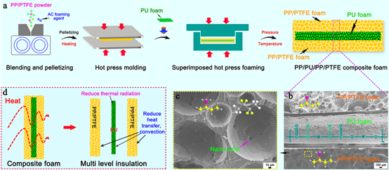 Abstract:With the increasing demand for green buildings and energy conservation, high-performance insulation foam materials with comprehensive properties will become the focus of research and development while also facing certain challenges. This study developed a Polypropylene/Polyurethane/Polypropylene (PP/PU/PP) sandwich foam via chemical foaming and nonsolvent-induced phase separation, with PP foam as outer layers and PU foam as the core. This unique structure enhances insulation performance by reducing the solid content to decrease phonon conduction, increasing gas conduction, minimizing the size of foam units to suppress convection, and reducing radiative heat transfer. Under the condition of an expansion ratio of only 3.71, its thermal conductivity drops significantly to 51.27 mW/(m·K). The PP outer layers effectively shielded the PU core from moisture and air, significantly improving the moisture resistance. Incorporating PTFE nanoparticles optimized the PP foam’s microporous structure and boosted mechanical strength, increasing the tensile modulus to 321 MPa. This scalable approach offers a strategy for the preparation of low foaming ratio and high thermal insulation performance foam.