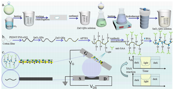 Abstract:In this study, the semiconductor channel layer of poly(ethylenedioxythiophene): poly(styrenesulfonate) (PEDOT: PSS)-reduced graphene oxide (rGO) was prepared by solution ultrasonic technology, and the photosensitive materials of tin oxide and zinc oxide quantum dots (QDs) were synthesized by the hydrothermal method. A novel fiber-based organic photoelectrochemical transistor (OPECT) was developed using PEDOT: PSS-rGO gated by SnO2 QDs-ZnO QDs heterojunction. The electrochemical properties were notably improved due to the synergistic effect of the heterojunction with the channel material. At the same time, serum amyloid A (SAA) biosensors have been developed based on OPECT and antibody modification, showing superior sensitivity of 151 mV/dec in the range of 1 ng/L to 1 mg/L, with good linear relationship (correlation coefficient of 0.9466) and low detection limit. At the same time, it shows good selectivity in other interfering substances and has been successfully applied to detect the SAA content in human serum in real samples. This research combines the new OPECT optoelectronic technology with appropriate flexible fibers for potential applications in portable and wearable bioelectronics devices.